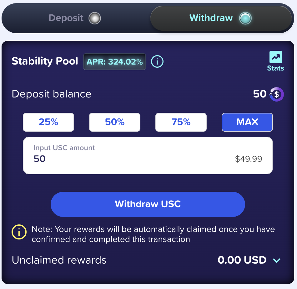 Choose the “Withdraw” tab and input the amount of $USC you withdraw from the Stability Pool.